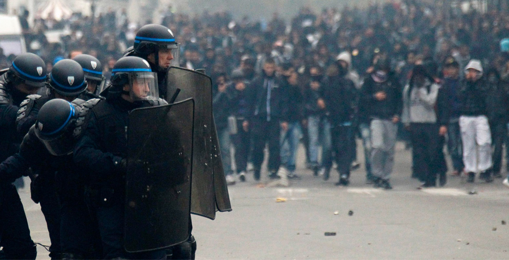 French police take position during clashes with youths after a demonstration over pension reform in Lyon, October 19, 2010. (REUTERS/Robert Pratta)